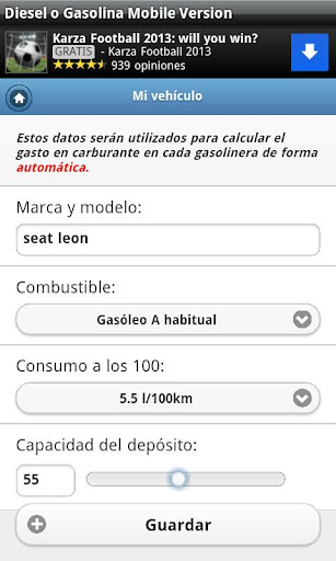 – Configurar los datos básicos de tu vehículo para calcular automáticamente los costes en gasolina o diesel de llenar el depoósito en cada gasolinera. Podrás comparar fácilmente cuales son las gasolineras más baratas.