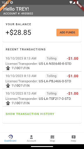 The GeauxPass Mobile App is brand new app that has been developed from the ground up and is aimed at providing the best use experience for Geauxpass customers. This online channel will allow customers to access a set of functionalities designed for account management. Customers can verify that their accounts are in good standing, replenish their prepaid accounts, pay documents, verify their account transaction history, download Statements, request additional transponders, and create new accounts. The Mobile Application allows Customers to manage their accounts for 24 hours every day in a week, except when disconnected from the internet or when the BOS is offline for planned maintenance.