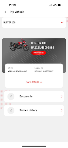 Vehicle Details: Access various information about your two-wheeler, including the VIN , engine number, last service date, sale date, last service kilometers, and service type.