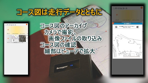 モータースポーツ向けにGPS位置情報と速度、加速度、ロール、ピッチなどの走行データと走行時の気象情報(気温、湿度、路面温度、天候、路面状態、気圧)、車両のセッティング情報を記録・分析するアプリです。使用方法はこちらです。GPS走行記録アプリ(Archive)に新機能の追加及び、広告なしで利用できるように日本向けにローカライズしたバージョンです。記録したデータは、走行軌跡を速度、加速度、ピッチやロールなどの情報と合わせて、ビュワーで確認できます。気温、湿度、天候については、インターネットを利用して気象情報を取得、自動設定ができます(OpenWeatherMAPのAPIキーの取得が必要)。気温、湿度については、SwitchBot温湿度計と連携して、自動設定ができます(SwitchBot温湿度計のMACアドレスが必要)。気温、湿度、路面温度、天候、路面状態、気圧のタップで直接編集もできます。内蔵GPSセンサー以外でGPSロガーを接続することで、内蔵GPSセンサーより精度の高い走行軌跡を記録することができます。走行するコースの選択は、コース(コース名)のタップでコース選択画面から選択できます(コースは事前に登録が必要)。コースの登録はコース名と内蔵カメラを使用してコース図を撮影記録できます(記録した画像はビュワーで確認できます)。セッティング情報の登録は、<パーツ>のタップでパーツ選択画面からセッティング情報を登録するパーツ(パーツ名)を選択します。セッティング情報として選択したパーツ(パーツ名)のタップでセッティング情報(調整値、メモ)を登録・変更できます(セッティング情報を登録するパーツは事前に登録が必要)。コース及び、パーツの登録、修正、削除は、メニューから「パーツ&コース」を選択します。パーツ&コース画面では、<パーツ>と<コース>をタップすることで、パーツまたは、コースの新規登録ができます。パーツの新規登録では入力画面でパーツ名、メモ、使用回数、コースの新規登録では入力画面でコース名の登録が可能です。パーツの修正は、修正したいパーツ(パーツ名)をタップします。コースの撮影は、撮影したいコース(コース名)のタップで、メニューから「カメラで撮影する」を選択します。撮影したコースの確認(ビュワー)は、メニューの「イメージを表示する」を選択します。コース名の変更は、メニューの「コース名を変更する」を選択します。走行データおよび、セッティング情報は左スワイプで削除できますす。コース及びパーツの削除は、パーツ&コース画面で上スワイプでおこないます。