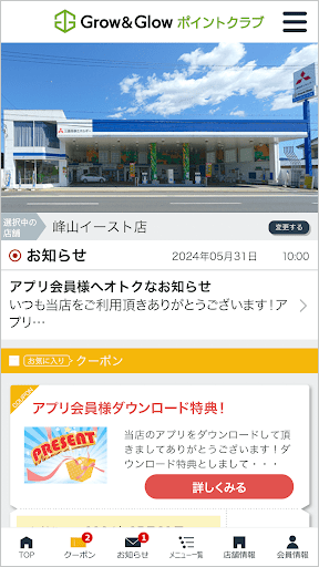 当社のアプリ「Grow&Glowポイントクラブ」は給油やカーメンテナンスをするたびにスタンプが貯まり、決められたスタンプ数を貯めるとお得なプレゼントクーポンと引き換えができる、貯めて楽しいもらえて嬉しいお得なアプリです。また、ご登録いただいた店舗で利用いただけるお得なクーポンや各種メニューの割引情報を配信しておりますのでぜひご活用ください。