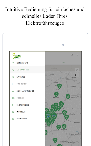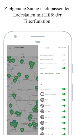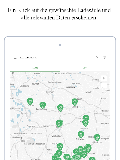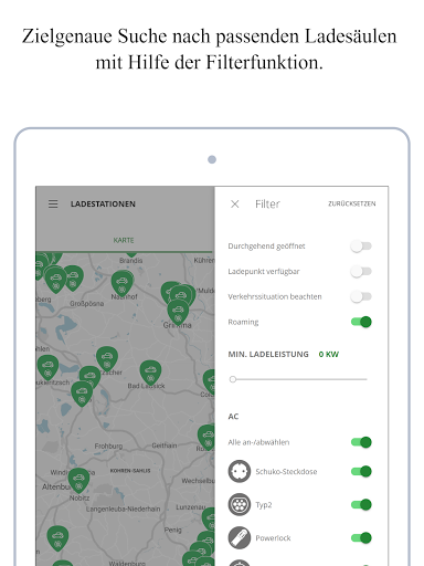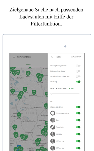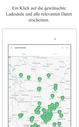 • Übersichtskarte mit Live-Anzeige: Suche nach Ladestation, Standort, Steckertyp und Verfügbarkeit