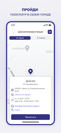 • благодаря геолокации определить ближайшую диагностическую станцию
