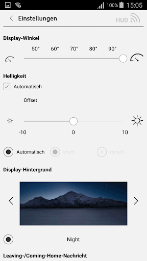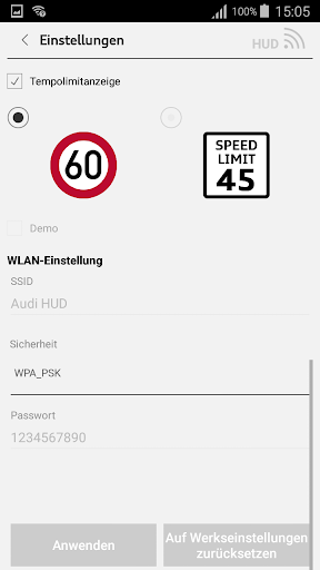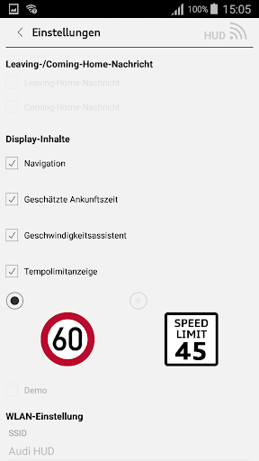 Its capabilities includes adjustment of display angle, brightness and Coming-home/Leaving home message. The seamless connection between the Head-up Display and the smartphone occurs via a internal Wi-Fi hotspot. All functions of the Audi HUD app require a Wi-Fi connection between the HUD and a smartphone.