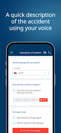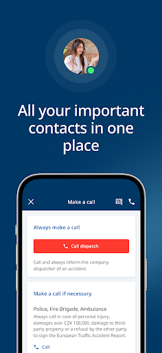 The interactive guide quickly and clearly takes you through the key steps that are necessary in the event of an accident. It enables you to record the location, date and time of the accident, call for the necessary help, take important photos and describe the accident, and it advises you on how to fill in the accident report. If necessary, you can easily contact your helpdesk or lawyer on the phone, and thanks to the integrated translator, you can communicate with anyone, anywhere. You will report all the necessary information about the accident in complete form to your company for further processing.