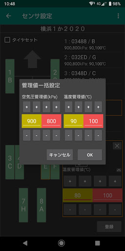 ・空気圧・温度の異常をお知らせする管理値(赤色と黄色)の設定