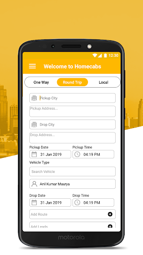 > Select travel type (1. Outstation, 2. One Way Local:-> 4 Hour & 40 KM / 8 Hours & 80 KM, One Way), Select Start and Destination city, Travel date and Return Date, then click on Book