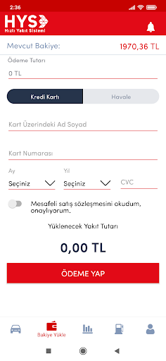 HYS ile belirlediğiniz aylık limit oranında, nakit ya da kredi kartıyla herhangi bir ödeme yapmadan, aracınızdan inmeden yakıt ikmalini kolaylıkla yapabilirsiniz.