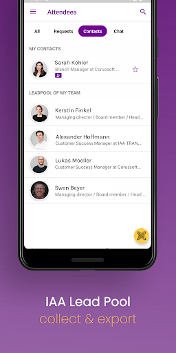 The practical Match-Making function offers trade visitors a digital community for sharing news and views and for networking. You can start as soon as you have activated the function and completed your profile. Search for contacts and launch a discussion right away by sending a message. Use the IAA App to make new contacts – wherever you are.