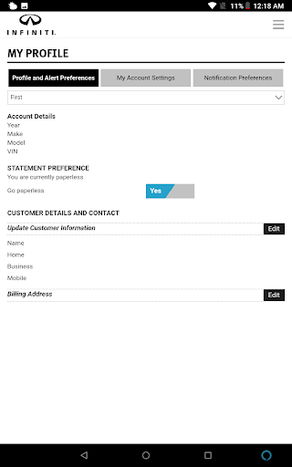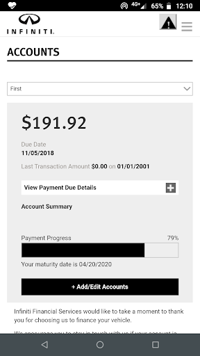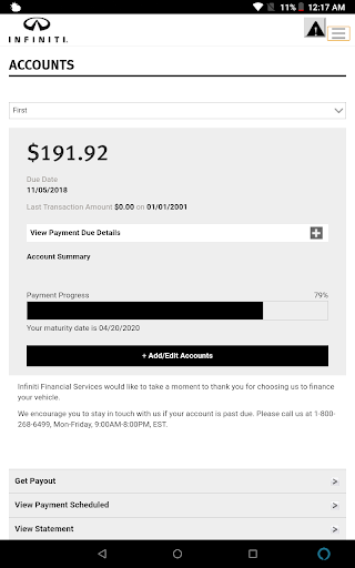 The INFINITI Financial Services (IFS) Online Account Manager app allows an existing IFS customer to manage their account on-the-go.