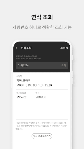 – 차량번호만 입력하면 차종, 배기량, 연식이 자동 입력됩니다.
