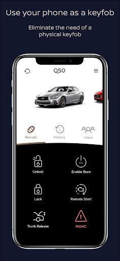 The INFINITI Virtual Key offers a quick way to quickly access your vehicle from your smartphone, replacing the key fob. This app enables you to seamlessly share your vehicle with family and friends by creating multiple Virtual Keys and managing them from your smartphone.