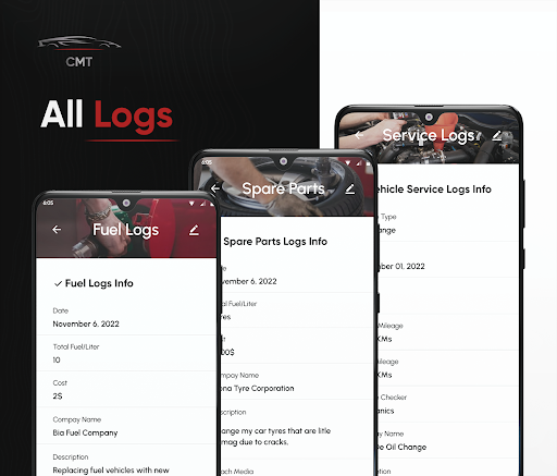 • Fuel Logs, Spare Parts Logs, Vehicle Logs