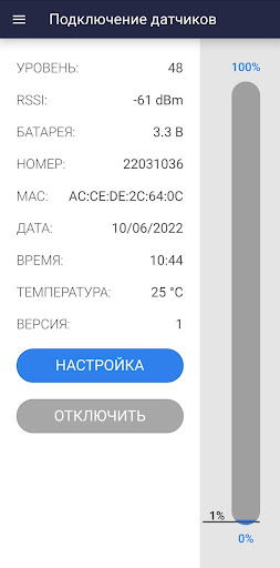– Отображение уровня измеряемой жидкости, заряда батареи, сигнала RSSI и положения датчика по акселерометру