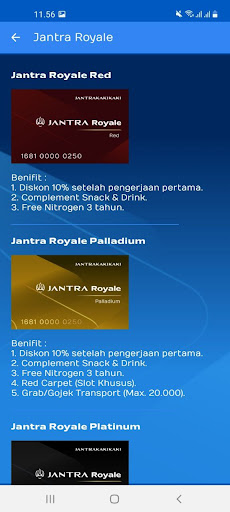 Jantra Royale adalah aplikasi untuk pelanggan dan fans Jantrakakikaki. Aplikasi ini memberikan kemudahan dalam menghubungi bengkel, membuat reservasi online, mendapatkan kupon, member / loyalty card dan inisiatif promosi lainnya dari Jantrakakikaki. Jantrakakikaki, bagian dari Janta Group, adalah spesialis Workshop profesional untuk sistem suspensi mobil. Rekondisi suspensi seperti Tie-rod, Long Tie-rod, Link-Stabil, Shock Absorbers, EPS (Electric Power Steering). Jantrakakikaki juga menyediakan layanan Speed Balancing dan spooring.