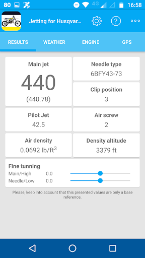 – Results: in this tab, the recommended main jet, needle type and clip position, pilot jet and air screw position are shown. These data are calculated depending on the weather conditions and the engine configuration introduced in the other tabs. In addition, this tab lets to make a fine tuning adjustment to adapt to a concrete engine and carburetor.