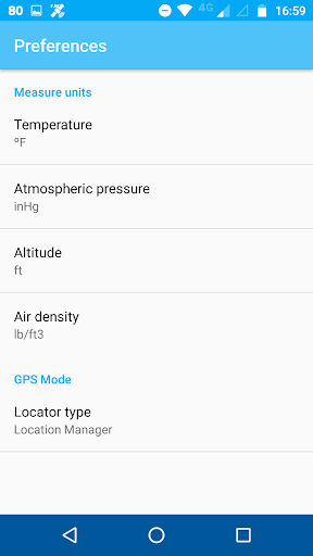 The application can manage different measure units: meters and feet for altitude, ºC and ºF for temperatures, mb, hPa, inHg, mmHg for pressure.