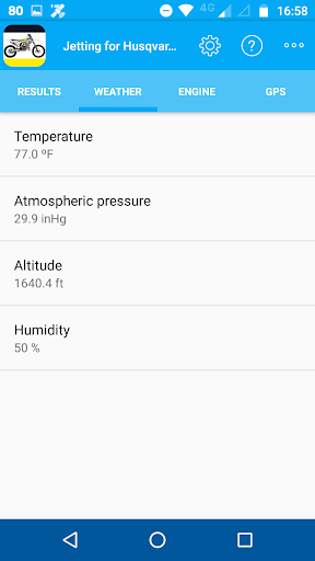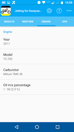 This app will help you configure the carb of your 2 strokes Husqvarna dirt bike (TC, TE, TX) to improve its performance with no need of repair manual or owner’s manual. Using weather conditions and your engine / carburator configuration, the app will show you a recommendation about jetting to your specific bike, so it can be useful to get a spot-on jetting configuration and adapt it to weather changes.
