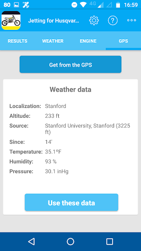 In order to get the weather values, the application can use the GPS to obtain the position and altitude, and the network connection to get the temperature, pressure and humidity from the nearest weather station. Nevertheless, the application can run without GPS and internet connection, in this case, the user must enter the altitude and weather data.
