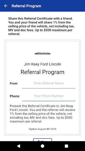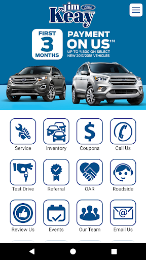Jim Keay Ford Lincoln mobile customer engagement app provides customers with a wide range of features/benefits, including scheduling a service appointment, viewing new and used inventory, redeeming mobile offers, sharing dealer promotions, viewing special events, referring new customers, redeeming loyalty rewards, calling roadside assistance, booking a test drive, and contacting staff directory.