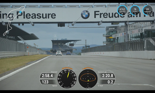 Record video with overlays during the session without postprocessing. The app includes in the video the current speed, acceleration, track position or vehicle data obtained by OBD. Use the “REMOTE” mode to control another device like an action camera, recording from the most impressive point.