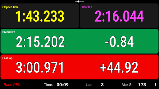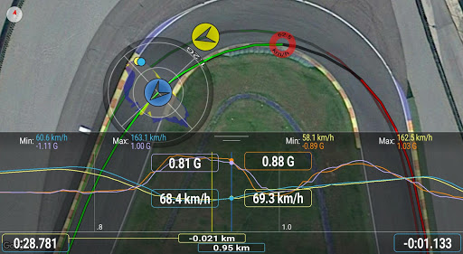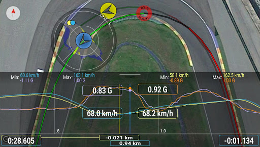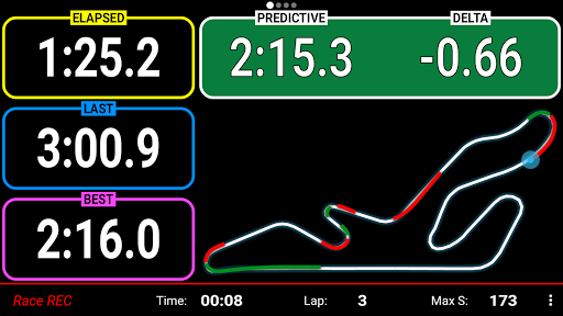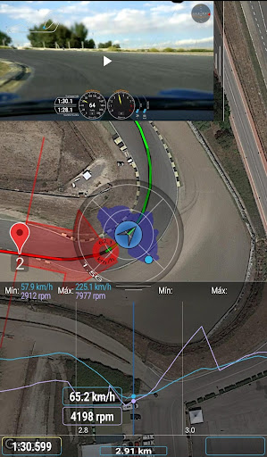 Improve your driving skills during the session. The app shows your current position within the track (very useful when the track is unknown) with the areas where you have gained/lost time or gone faster/slower than the reference lap. Modify the racing line and immediately see if you have improved or not. Improve regularity thanks to the predictive lap time.