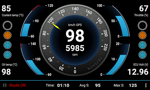 Connect a Bluetooth OBD ELM327 device and record vehicle data like rpm, accelerator command or engine temps. It includes a gear shift light and sound indicator and coolant/oil temp alerts. Analyze your heel and toe with the gear ratio parameter. Data is recorded at maximun rate, regardless of GPS rate.