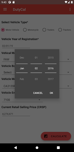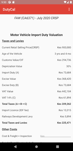 The app uses latest Kenya Revenue Authority (KRA) published motor vehicle valuation template, published on 30th June 2020 and effective from 7th July 2020.