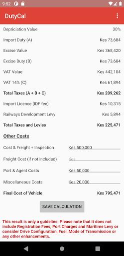 After selecting a car type, make and model, the app will calculate total tax and levies and it provides options to add additional cost like cost of freight, inspection, insurance, port and agent fees for calculation. It provides the following information.