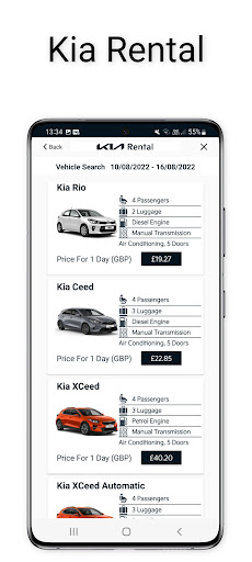 Kia Rental mobile application allowing direct vehicle hire bookings with Kia Rental dealers throughout the UK.