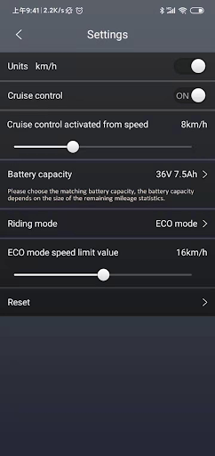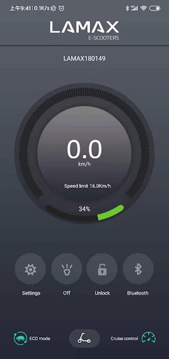 Zobrazuje podrobné informace o koloběžce. Jednoduché spárování pomocí Bluetooth. Lze měnit nastavení koloběžky a využít chytré funkce jako je tempomat nebo zámek koloběžky. V aplikaci přehledně zkontrolujete ujetou vzdálenost, stav baterie, odhadovaný dojezd nebo si zvolíte jízdní režim.