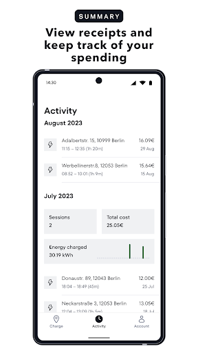 – View charging station addresses, dates, prices, and consumption of energy of each charging session
