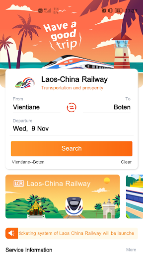 LCR Ticket is the official mobile phone ticketing application software launched by Laos-China Railway Co., Ltd. The software has functions such as ticket inquiry, reservation, online payment, ticket change, refund, order inquiry, frequent contact management, and personal data modification. To provide passengers with convenient, efficient and fast travel services.
