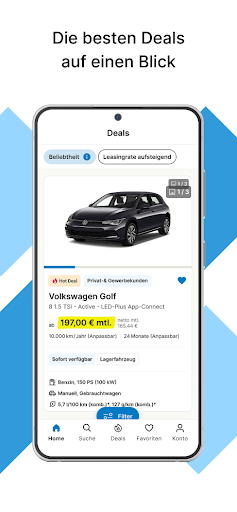 Auto-Leasing per App: Auf LeasingMarkt.de vergleichen Sie mehr als 25.000 Leasingangebote von Händlern aus ganz Deutschland und finden Ihren Traumwagen zu Top-Konditionen. Ob Neuwagen oder Gebrauchtwagen, Bestellfahrzeug oder Lagerfahrzeug – LeasingMarkt.de ist Ihr Marktplatz für günstige Privat- und Gewerbe-Leasing-Deals ohne Anzahlung. Suchen Sie mit der kostenlosen App schnell, einfach und unverbindlich nach dem perfekten Leasingangebot für Ihr Wunschfahrzeug.