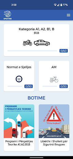 DPSHTRR sjell aplikacionin zyrtar të simulimit të testit teorik të lejes së drejtimit. Qëllimi kryesor i këtij aplikacioni është t’ju vijë në ndihmë të gjithë kandidatëve që po përgatiten për provimin e teorisë. I përditësuar sipas legjislacionit në fuqi të Kodit Rrugor, aplikacioni sjell pyetje dhe simulime sipas përmbajtjes së manualit zyrtar të përgatitjes teorike, të publikuar në faqen zyrtare të DPSHTRR. Përmbajtja e këtyre pyetjeve është e njëjtë me pyetjet që janë në testin real teorik që zhvillohet për pajisje me lejedrejtimi të kategorive të ndryshme.