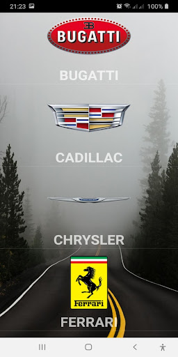 The app contains the following car brands: Acura, Alfa Romeo, Aston Martin, Audi, Bentley, BMW, Bugatti, Cadillac, Chrysler, Ferrari, Genesis, Infiniti, Jaguar, Lamborghini, Land Rover, Lexus, Lincoln, Maserati, McLaren, Mercedes, Mini, Pontiac, Porsche, Rolls Royce, Tesla, Volvo.