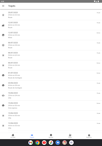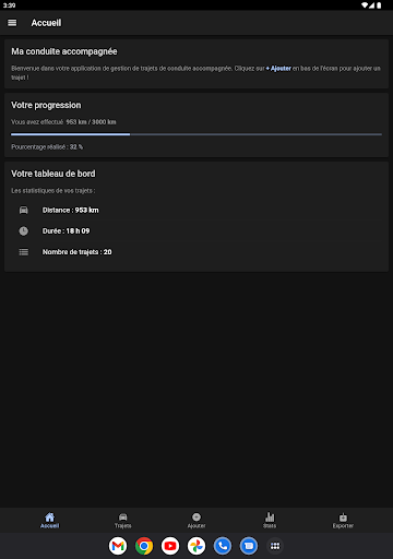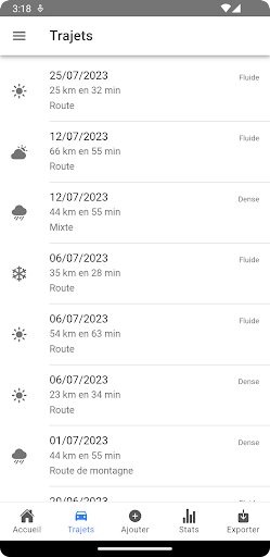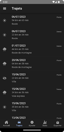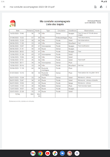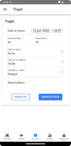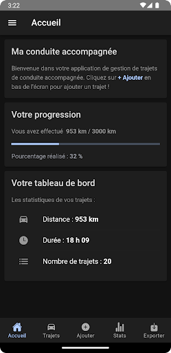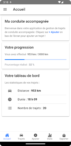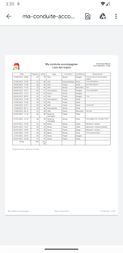 Cette application vous permet d’enregistrer vos trajets de conduite accompagnée directement sur votre smartphone avec toutes les informations importantes sur vos trajets : distance, durée, type de trajet (ville, voie express, etc.), conditions de circulations, conditions météo et observations. Vous enregistrez ainsi vos données de trajets en quelques secondes ! Vous pourrez les exporter à tout moment via un fichier PDF directement depuis votre smartphone.