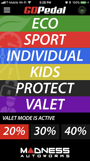 Valet: Limit the response from your throttle pedal so the only way your vehicle can be driven in Valet Mode is slow and gentle