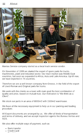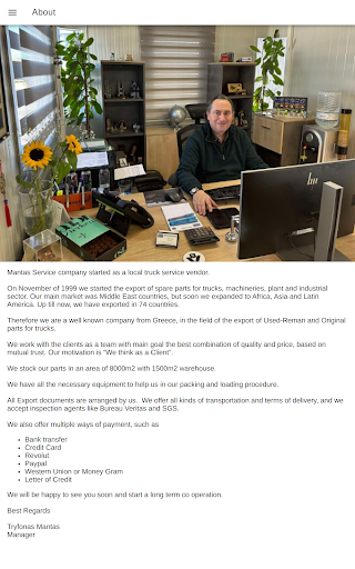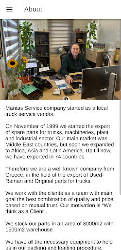 Mantas Service exports parts for trucks, machineries, plant and industrial sector, in 74 countries.