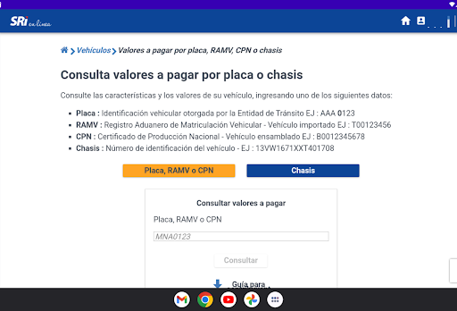 La aplicación puede mostrar detalles importantes como la marca, modelo, año, número de chasis, número de motor, tipo de combustible, fecha de registro, fecha de última revisión técnica, historial de multas y cualquier otro dato relevante que esté disponible en la base de datos del departamento de tránsito o agencia gubernamental correspondiente.