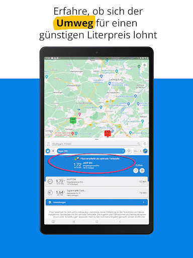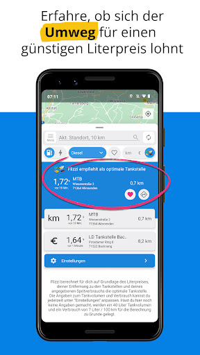 NEW: Check if a detour is profitable – Flizzi recommends the best gas station depending on the consumption, capacitiy of your car as well as your distance to the gas stations.*