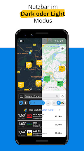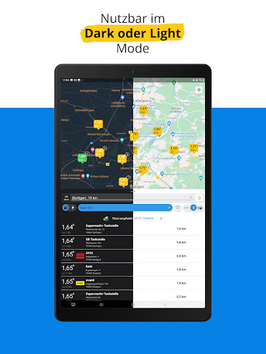 The current fuel prices are either displayed in full-screen map or list or in a combined view. The main menu including a route planner, price alarm, consumption calculator and much more can be found on the left side of the search mask, on the right side you can find a button to referesh the prices.Via slider above the list you can easily switch to the charging points area.