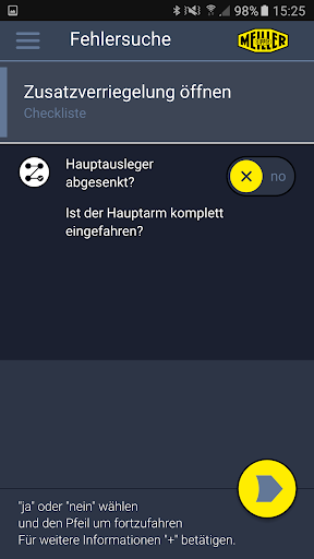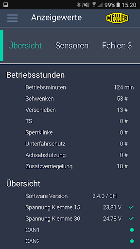 everywhere any time. This occurs by explicit error messages from trouble code log or by guided troubleshooting. This significantly decreases time for troubleshooting and avoids or significantly reduces vehicle down time. Even more the MEILLER Diagnostics App allows you to customize of dumper and device settings. To use this functionality it’s required to register at MEILLER. The MEILLER Diagnostics App also gives full control on operating data of your MEILLER structures, since the MEILLER Diagnostics App displays this information. Last not least the MEILLER Diagnostics App allows easy contact and navigation to your nearby MEILLER service station. The MEILLER Diagnostics App is available in German and English. Support for French, Spanish, Italian and Polish is planed.