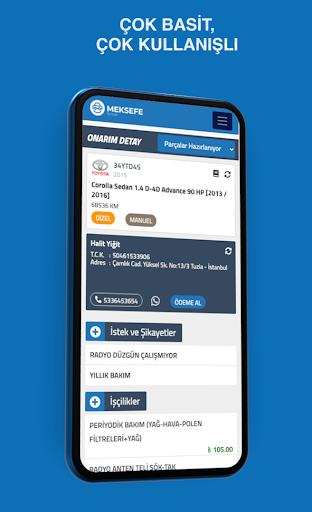 Rezervasyonlar, Onarım Emirleri, Yedek Parça Yönetimi, Müşteriler, Cari Hesaplar, Tedarikçiler, Faturalandırma, Online Tahsilat ve çok daha fazlası Meksefe de