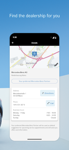 KEEPING CONTACT WITH YOUR SERVICE PARTNER: Find an authorized Mercedes-Benz retailer in your area quickly and easily, and save your preferred partner in the app.