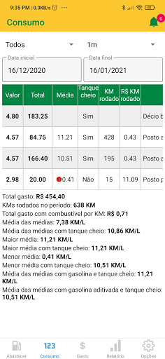 Saiba a média de KM/L de seus veículos e outras estatísticas.