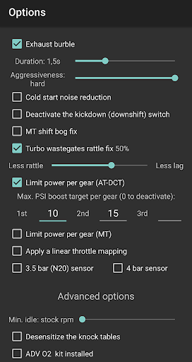 – Provides handy options like power limiter per gear, wastegate rattle fix or exhaust burble settings.