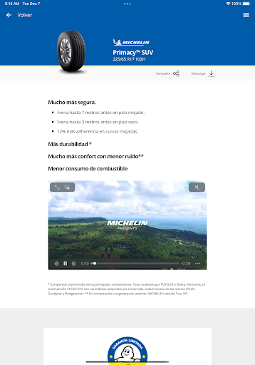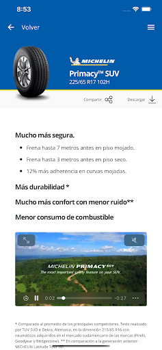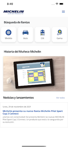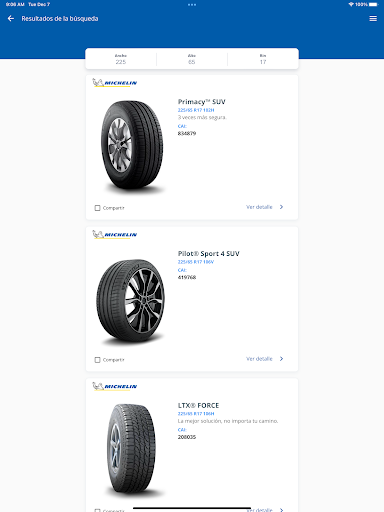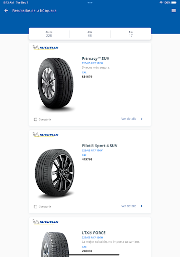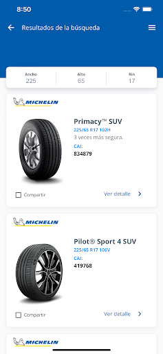 Busca llantas de la marcas Michelin® y BFGoodrich® por medida, modelo del automóvil, gama o código CAI. Consulta y/o comparte la ficha técnica directamente desde la aplicación. La aplicación está actualizada con el último catálogo de llantas del grupo Michelin® en Colombia.