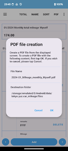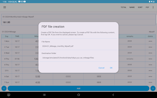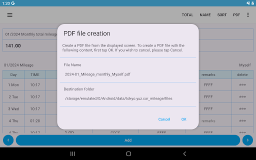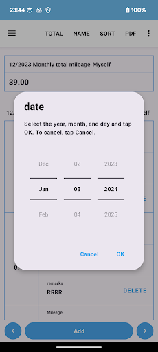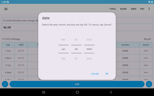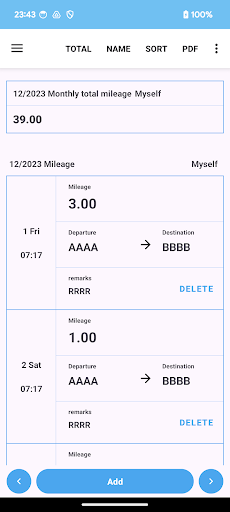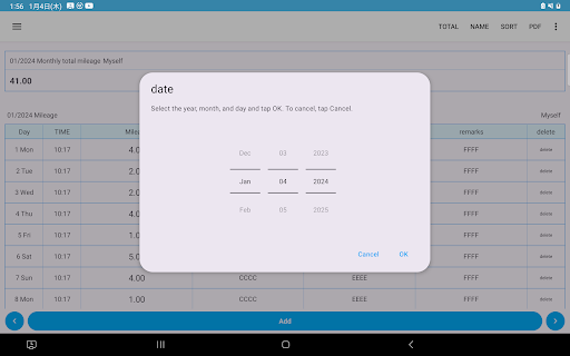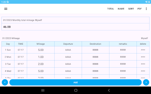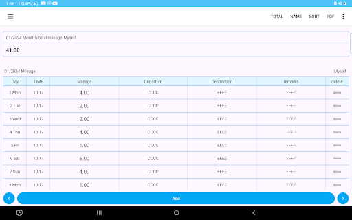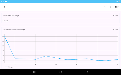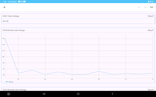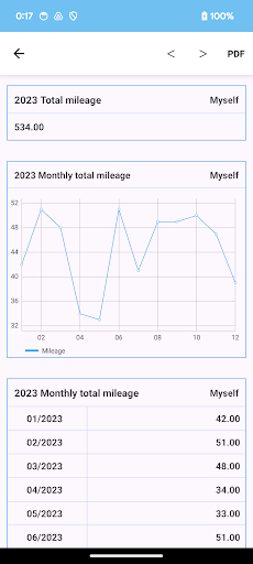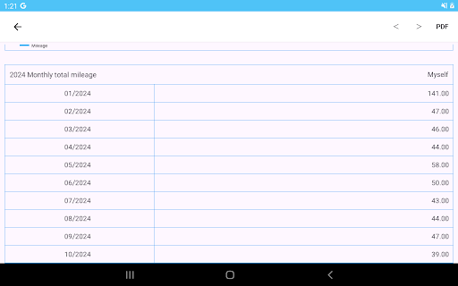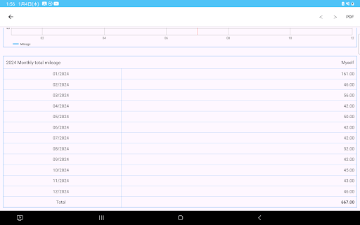 Tap the total at the top to display a graph and table of the total mileage for one year and the total mileage for each month.