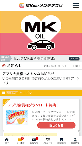 エムケイ石油株式会社は京都府でサービスステーションを展開し、お客様の愛車のトータルサポートを行うべく幅広いサービスを提供しております。当社のアプリ「MKcarメンテアプリ」ではスタンプ管理をはじめ様々なサービスの管理が可能の他、ご登録いただいた店舗で利用いただけるお得なクーポンや各種メニューの割引情報を配信しております。